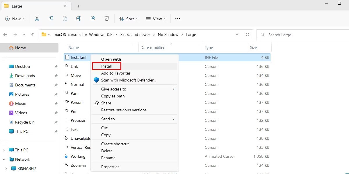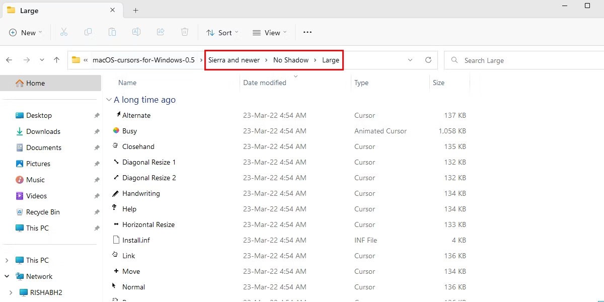 2. Navigate to the extracted folder and enter the folder named Sierra and newer > No Shadow > Large . For this tutorial, we will install the large and no-shadow cursor themes. You can choose which variant you want to install by navigating to the desired folder.