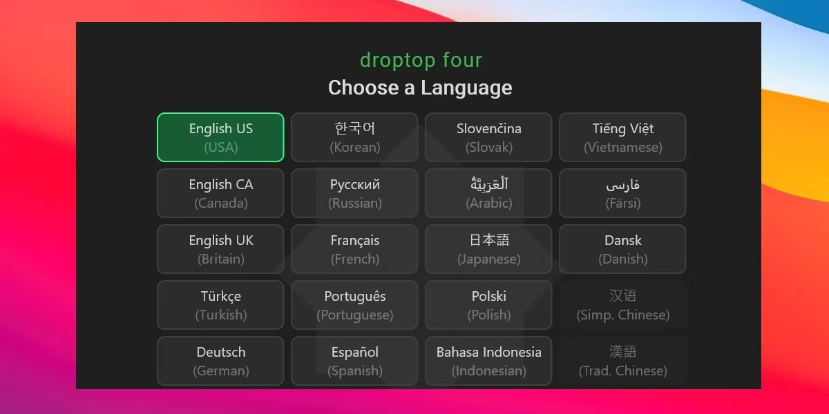 4. Click Continue to start setting up Droptop 4. Select your language and follow the on-screen instructions.