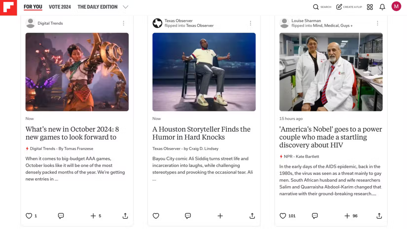 Your For You page will show you articles and content that Flipboard thinks you’ll like, with the option to comment, like, and share individual Flips. From here, you can click the plus sign and add articles to your board, called Magazines. You can also add your own Flips by entering links and photos, and even invite other contributors to your magazine.
