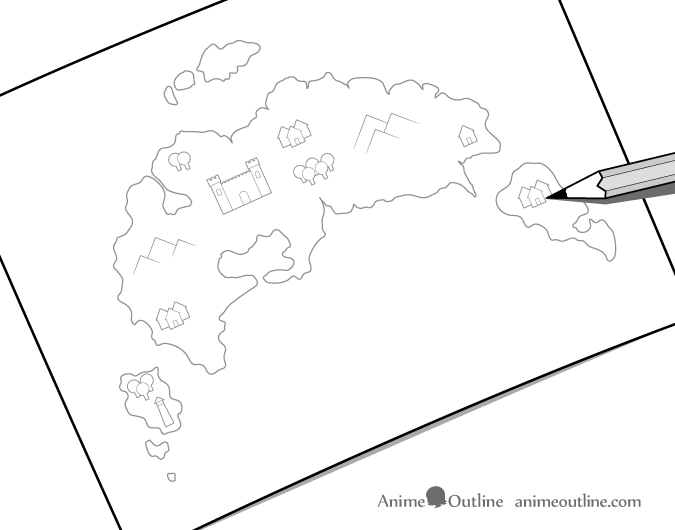 Continuing with the fantasy story setting example, start by drawing a map of the world or part of the world where the story takes place. You can use icons to represent different locations (you can also add text to each icon).
