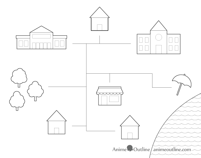 Planning these settings will help you avoid inconsistencies when drawing panels later, and will also help you plan the flow of the story. For example, when drawing a character going to the beach, remember that he has to pass a convenience store first, so you can have him pick up a snack on the way. This will also help you avoid forgetting where the store is, not placing it on the way to the park in another volume.