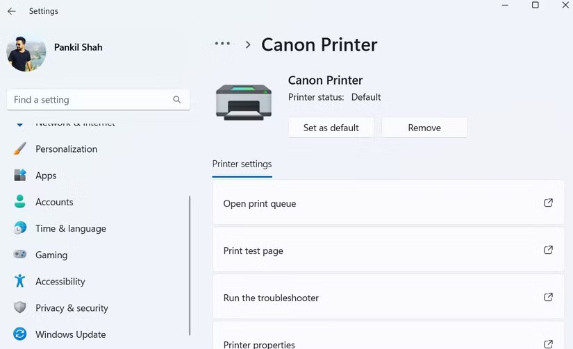 Test page printing option in Windows 11 Settings app