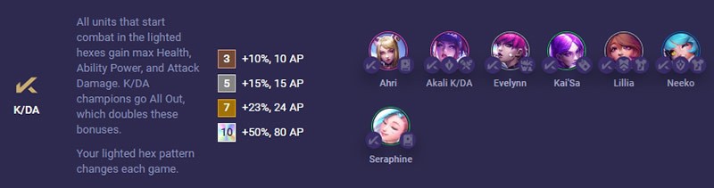 At the start of combat, all champions in the idol space gain maximum health, ability power, and AD. K/DA champions will evolve into their All Out versions and gain double these stats. The more K/DA members you add (celebrity guests, Superfans, and champions with seals all count), the more power milestones you'll reach, and the more initial stats you'll gain.