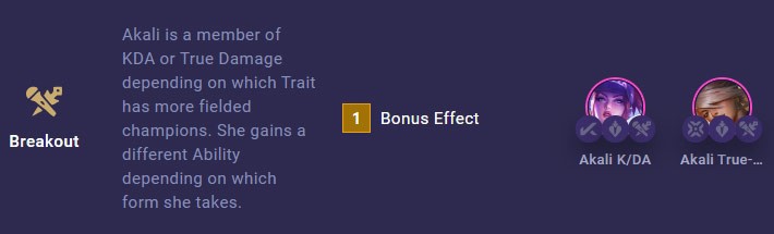 Akali will be a member of KDA or True Damage depending on which Team has more champions on the field. She has different Skills depending on the clan that Akali activates.
