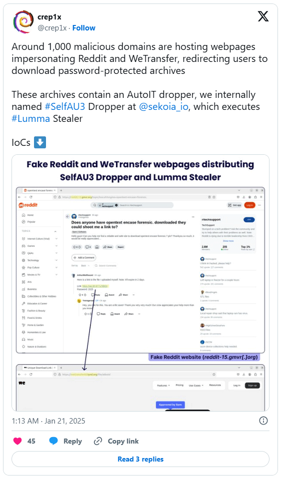 Security analyst @crep1x discovered the new Lumma Stealer campaign and uploaded a full list of compromised domains to GitHub. At the time of publication, there were over 500 pages impersonating Reddit and over 400 pages masquerading as WeTransfer — all of which contained malware download links.