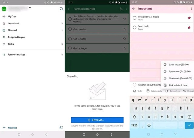 Adding tasks to a list is easy: just tap the “+” button in the bottom right corner. You can then set a reminder or repeat time. When you create a new list, you can give it a custom background by choosing a color or image from the available options. Additionally, Microsoft To-Do is a great collaboration app, allowing you to add users to your account and easily share lists you create.