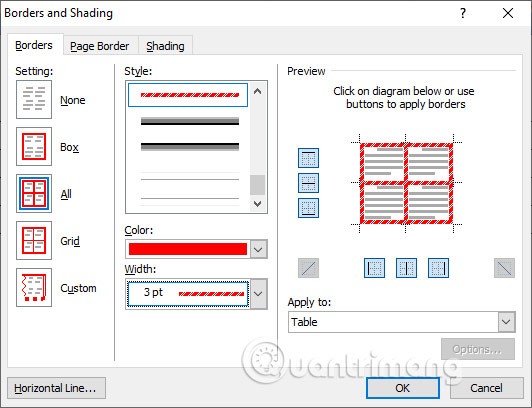 Now display the interface for you to customize the table border . We choose the table border style, color and size to use. Each option is displayed below for you to review. Click OK to apply that table border style in Word.