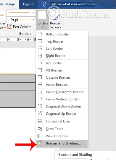 To display the table border editing interface like in Word 2007, we click on Borders and look down the list to see the Borders and Shading option...