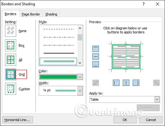 In case you only want to style the border around the table , but the lines in the cells remain the same, then we select the Grid item . Continue to select the style and choose the color for the border. Click OK to apply.