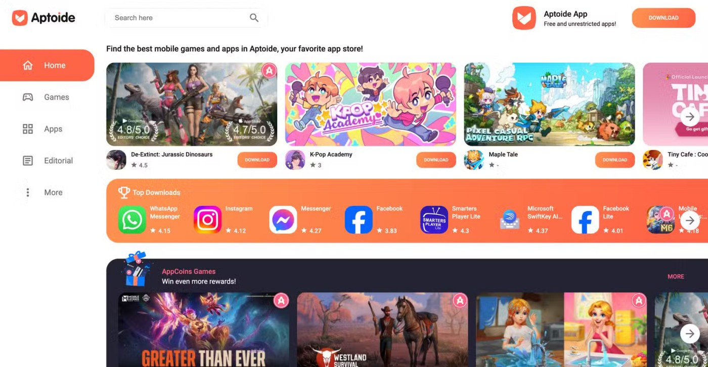 Aptoide is another giant in the APK downloading world; it has over 300 million users and is responsible for over 7 billion downloads. Like APKPure and Uptodown, the Android app store allows you to conveniently access the store and download APK files from your Android device. In addition to popular Android apps like WhatsApp and Facebook, you can use it to find apps that are not available on the Play Store.