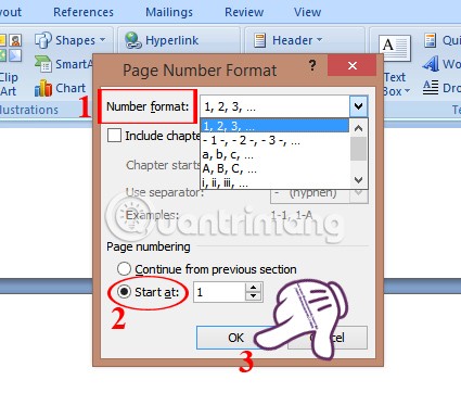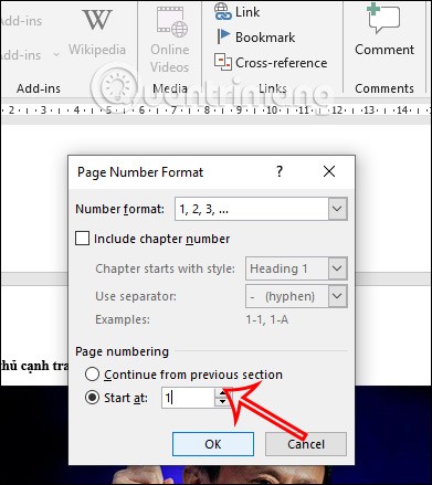 Now the interface is displayed for us to adjust the page numbering in Word. In the Format Page Numbers dialog box , select the number you want to start with and fill in the Start at field . For example, if you want to mark page number 3 as number 1, fill in 1 in the blank space.
