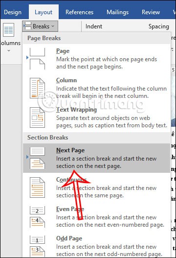 Next, the user clicks on the Breaks item , then looks down at Section Breaks and selects Next Page to proceed to set the Section for the Word page.