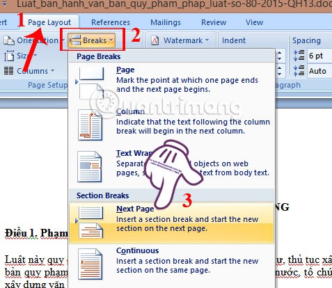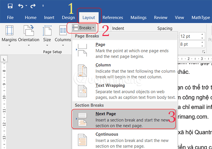 Step 3: Select the Page Layout tab on the ribbon bar and then select Breaks > Next Page to separate the text into 2 different sections as shown.