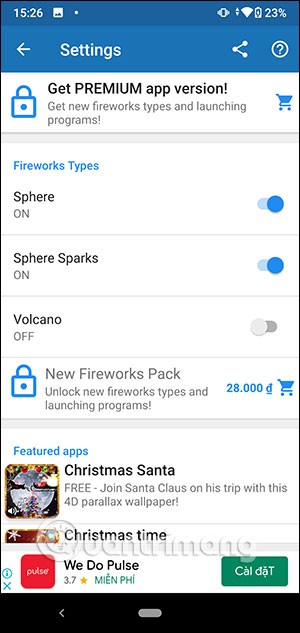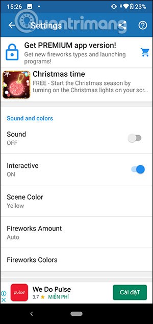In the application interface, first you click on Settings to set up the fireworks display interface. Switch to the new interface, first we choose the fireworks style at Firework Styles .