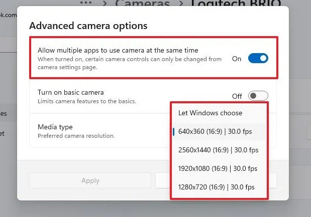 Switching to the new settings interface, users need to enable the Allow multiple apps to use camera at the same time setting to use the camera on multiple Windows applications.