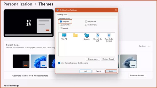 Step 4: The Desktop Icon Settings window appears. You need to tick the Computer line and select Apply. Through this operation, the This PC icon will reappear on the Desktop as usual.