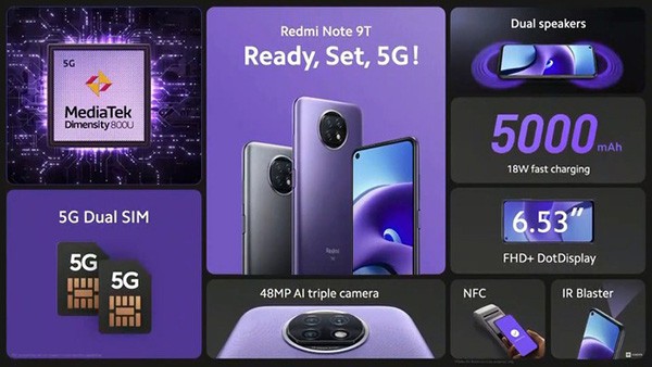 Redmi Note 9T comes in two colors: Nightfall Black and Daybreak Purple.