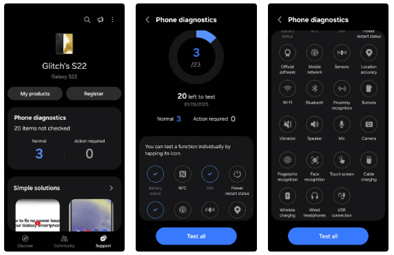The Samsung Members app lets you test your phone's most important hardware and software components. It lets you test everything from NFC, Bluetooth, and microphone to more practical features like charging cables, cameras, and speakers.