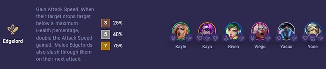 Saint Rade gains attack speed, doubled if their target is below 50% health. Edgelords with a 1 cell range will dash and pierce through enemies on their next attack.