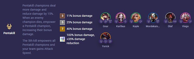 Pentakill champions take 15% less damage and deal bonus damage. In combat, each time you kill an enemy, a Pentakill champion is empowered, dealing 25% more damage. Every time you get 5 kills, all Pentakill champions are empowered and the entire team gains 50% attack speed.